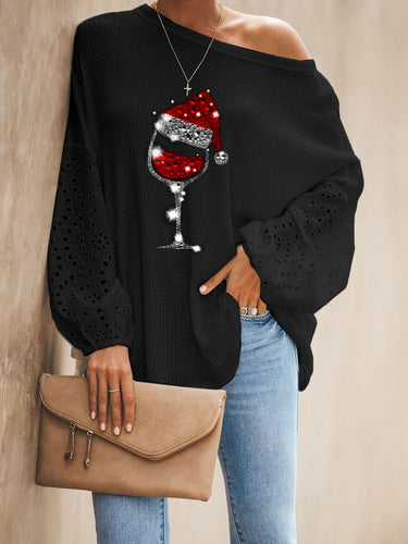 Woman's Christmas Red Wine Glass Plaid Print T-shirt