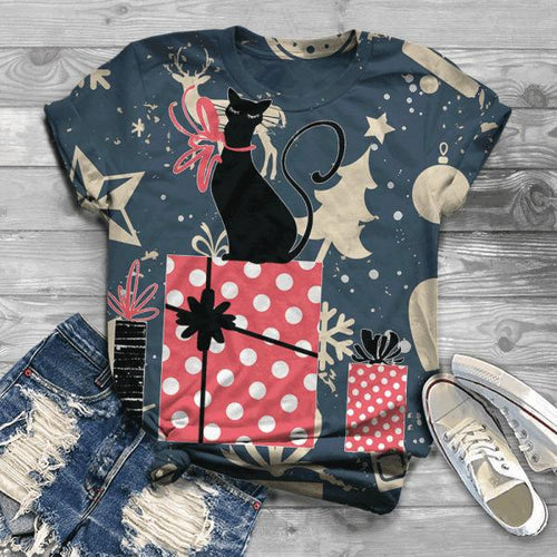 Women's Casual Christmas Cat Gift Graphic Print Crew Neck T-Shirt