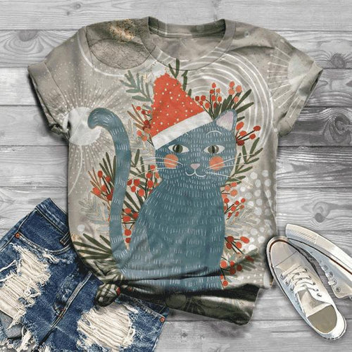 Women's Casual Christmas Christmas Cat Print Round Neck T-Shirt