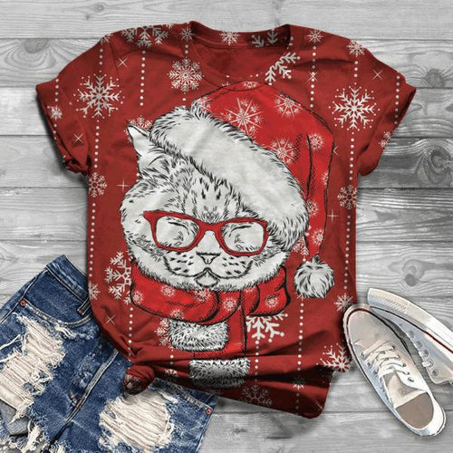 Women's Casual Christmas Christmas Wear Glasses Cat Pattern Printed Round Neck T-Shirt