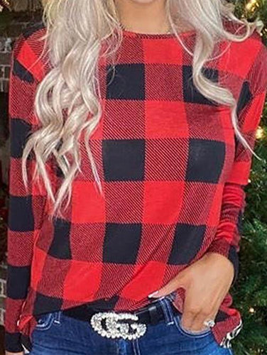 Women's Casual Merry Christmas Plaid Stitching Long Sleeve T-shirt