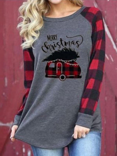 Women's Casual Merry Christmas Plaid Stitching Long Sleeve T-shirt