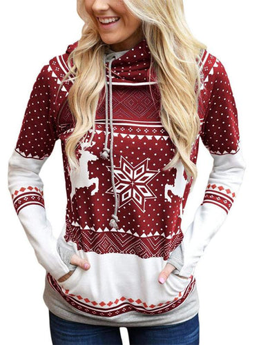 Women's Christmas Print Zipper Pocket Hooded With Leaky Finger-Red/