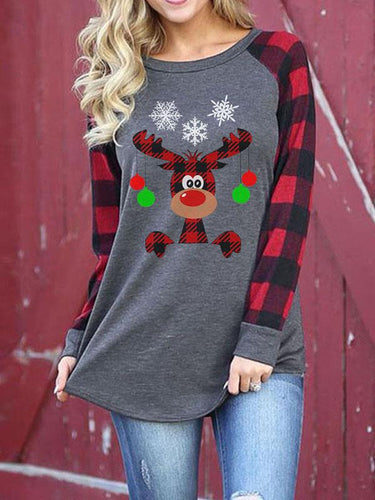 Women's Christmas Series Plaid Elk Snow Print Long Sleeve Sweatshirt-red,4size